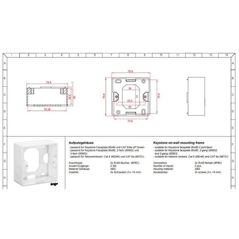 Keystone On-Wall Mounting Frame suitable for Keystone faceplate 80 x 80 and CAT 6/6A flush-mounted boxes The Keystone system knows no limits when it comes to installation. Take advantage of the modular connection system for standardised connectors and rectangular module receptacles (ports) in 14.9 × 17.0 mm pitch. The Snap-in system enables a wide variety of connection techniques, e.g. with coaxial sockets for IEC or F connectors, RJ45 jack sockets (CAT 5, CAT 6, CAT 6A), loudspeaker connectors (RCA sockets, screw and clamp connectors) as well as USB, fibre-optic and HDMI™ jack sockets. The Keystone modules can be universally applied and interchanged. The surface-mounted housing is compatible with a 2-port Ethernet wall socket for Keystone RJ45 connectors. May be used as a flush-mounted box or surface-mounted box Housing for Keystone Ethernet wall box with an outer frame of 80 x 80 mm Scope of delivery includes 2x screws for fastening. Technical specifications Connections construction form Keystone grid (14,9 x 17,0 mm) General Packaging type Bulk Dimensions / Weight Length 80 mm Width 80 mm Height 40 mm Consumption Unit 1 pc. in polybag