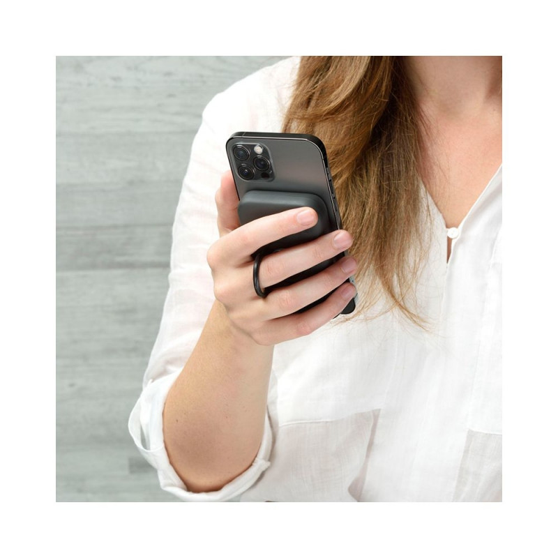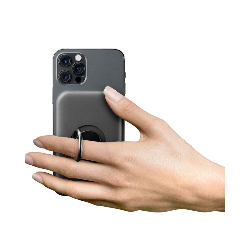 **Cellularline Ring MAG 5000** integreeritud STAND-rõngas võimaldab iPhone'i mugavat kasutamist laadimise ajal, hoides seda stabiilses asendis – ideaalne filmide vaatamiseks või videokõnedeks ilma telefoni käes hoidmata. Lisaks toimib rõngas ka käepidemena, mis muudab powerbank'i kaasaskandmise ja kasutamise reisimisel lihtsaks. See on praktiline lahendus aktiivsetele kasutajatele, pakkudes mobiilset energiaallikat.