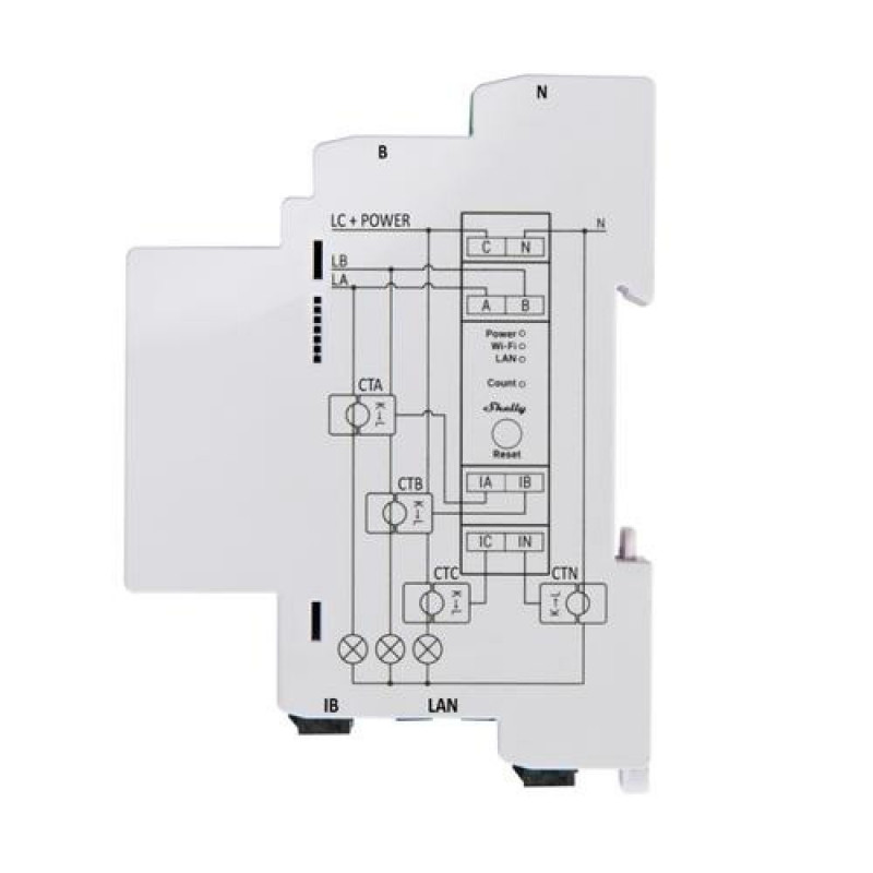 <b>Next-generation DIN-mountable 3-Phase Energy Meter </b><br>Shelly Pro 3EM is a DIN rail mountable three-phase energy meter. Enhanced with all the gen2 firmware flexibility and LAN connectivity, it provides professional integrators with additional options for end-customer solutions. Shelly Pro 3EM reports accumulated energy as well as instantaneous voltage, current, and power factor per phase in real-time.<br><br><b>Next-generation 3-Phase Energy Meter</b><br>Shelly Pro 3EM is a Wi-Fi-operated DIN-mountable 3-Phase Energy Meter with Wi-Fi, Bluetooth, and LAN connectivity. With active energy measurement accuracy of 1%, Shelly Pro 3EM can be used to monitor the consumption of any home appliances, electric circuits, and office equipment individually. It features 60 days of on-device historical data with a 1-minute resolution for each phase. Additionally, its scripting functionalities allow for the execution of complex scenes and provide broader monitoring abilities.<br><br><b>4-quadrant measurement</b><br>Measure capacitive and inductive load types of active imported and exported energies. <br><br><b>Accuracy class B (active energy)</b><br>Shelly Pro 3EM has a measurement accuracy of 1%.<br><br><b>MODBUS support</b><br>Allows for easy and fast deployment in existing industrial installations. <br><br><b>Wi-Fi, LAN, and Bluetooth connectivity</b><br>Simultaneous Ethernet and Wi-Fi usage. MQTT, inbound and outbound WebSocket, UDP, mTLS support.<br><br><b>Power monitoring</b><br>Monitors mono-phase electrical systems with up to 3 points simultaneously. Fast notifications and at least 60 days of 1-minute records storage.<br><br><b>Scripting functionalities</b><br>Shelly Pro 3PM fully supports mjS scripting, allowing you to create further features and functionalities.<br><br><b>Industry-grade security</b><br>Shelly Pro 3EM supports mTLS for MQTT, HTTP, and secure outbound WebSockets. Its industry-grade security allows for direct connections to your cloud infrastructure, reducing the cost of deploying complex networks and VPNs.<br><br><b>Industrial installations</b><br>Shelly Pro 3EM brings support for MODBUS for voltage, current, power, and energies. You can accurately sample your energy usage and instantaneous values of voltage, current, and power. Our new firmware platform allows for custom implementation that can report as fast as every 100ms to your infrastructure.<br><br><b>2-way energy consumption monitoring</b><br>Monitor your home, office, or factory, and avoid additional expenses or drops in voltage that can damage your appliances and devices. Shelly Pro 3EM can calculate 2-way consumption: produced and used energy for each of the three phases. The device can be configured to measure three separate circuits of a mono-phase electrical system. View the quality of your electricity network regarding active power, reactive power, voltage, and power factor.<br><br><b>Local control</b><br>Thanks to Shelly Pro 3EM's scripting functionalities and webhooks, you can now easily control other Shelly or Wi-Fi devices on your local network. Use these capabilities to set exact parameters for heating, cooling, or electric vehicle charging based on PV production and have your devices automatically shed power usage. All these work without using a cloud. <br><br><b>Solar panels monitoring and control</b><br>Keep track of how much energy your solar panels or wind turbines are generating and save effortlessly. Shelly Pro 3EM provides real-time information about the efficiency of the solar and wind energy system, as well as historical data on how much energy has been generated and consumed every minute for the past 60 days. This helps you control the energy flow, getting the most out of your solar panels and wind turbines. To take it a step further, connect Shelly Pro 3EM to your other Shelly devices and create scenes to trigger desired actions like turning off appliances or sounding alarms. Shelly Pro 3EM. Power source type: AC, Maximum current: 120 A, Frequency range: 50 - 60 Hz. Width: 94 mm, Depth: 19 mm, Height: 69 mm