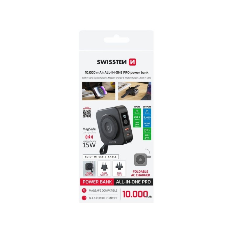 The Swissten All-in-One Pro Power Bank is the perfect travel companion with an integrated AC charger, multiple outputs, and wireless charging pads. With a 10,000 mAh capacity and a built-in USB-C cable, it offers fast and reliable charging for your phone, tablet, TWS earbuds, and Apple Watch – whether at home or abroad. More than just a compact power source, it’s a universal travel charger that eliminates the need to carry multiple adapters and cables.