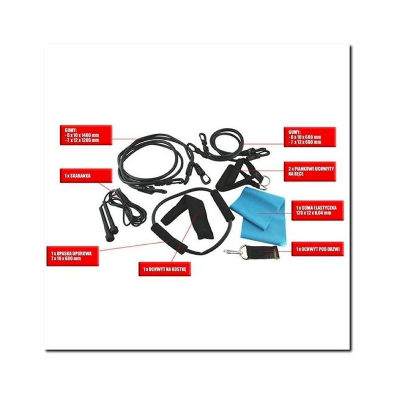 High quality, well-thought-out design, and durability guarantee a successful workout in any conditions. The set includes four resistance bands, one elastic band, one resistance band, two foam hand grips, one ankle strap, one door strap, and a jump rope.