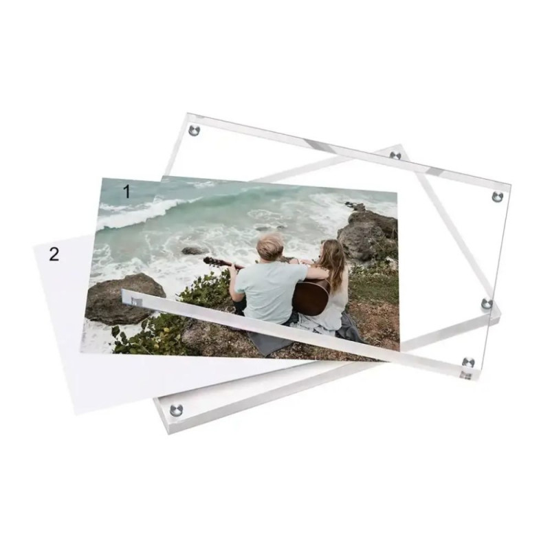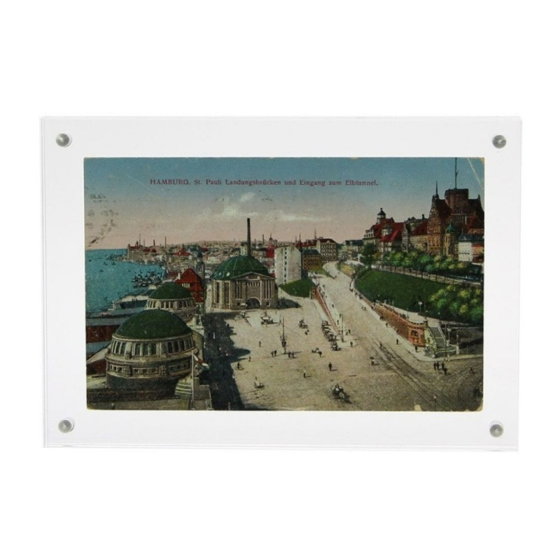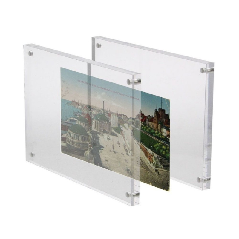 - Kasutamine on lihtne: postkaart, foto vms. asetatakse akrüülist poolte vahele, mis kinnituvad üksteise külge magnetitega. Kaart jääb otsekui “hõljuma” ning on raami poolt kaitstud.