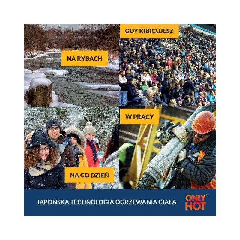 Immediately after tearing the package, heat is released. This occurs through contact between iron powder and oxygen – an oxidation effect. The perforation [membrane] in the cellulose nonwoven fabric of each warmer ensures proper oxygen supply, thus ensuring perfect and even heat distribution, allowing the warmer to operate for 6-10 hours. The generated heating temperature of ONLY HOT® products is regulated by the microporous nonwoven fabric, preventing overheating and the risk of burns. Depending on the warmer type, it reaches temperatures between 50 and 70 degrees Celsius.