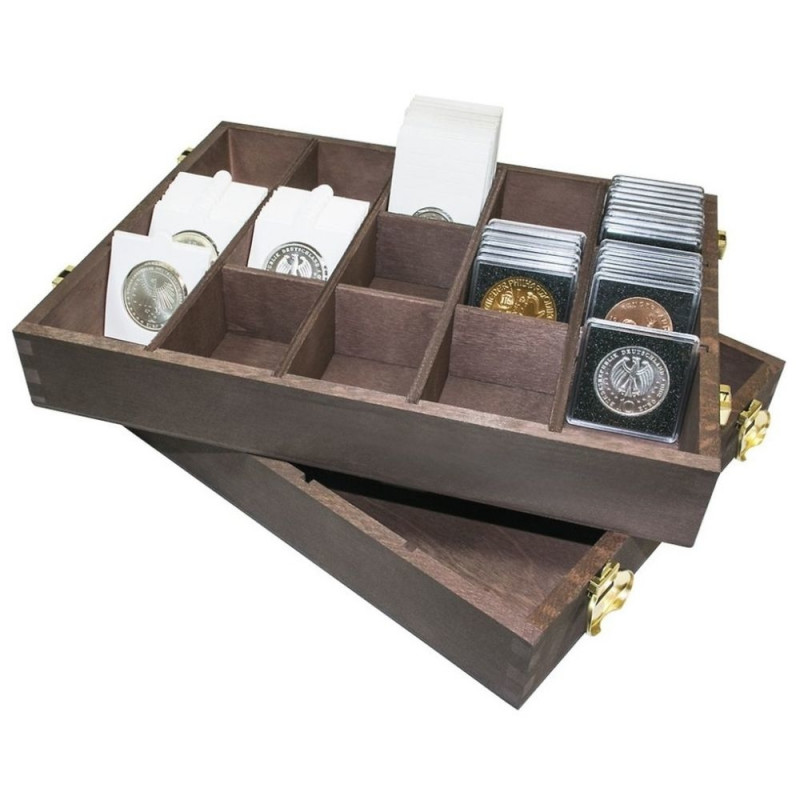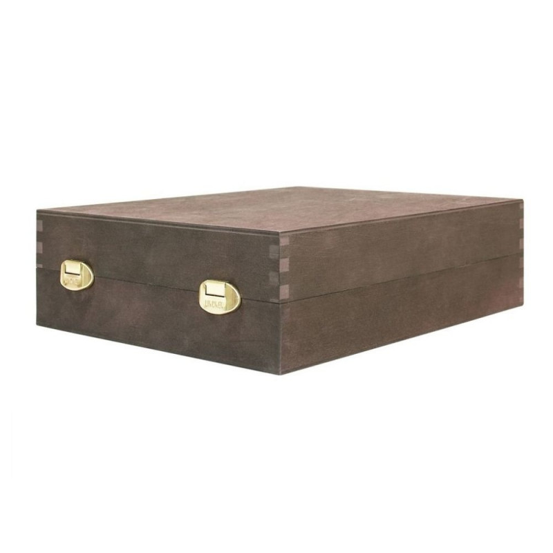 - Tumedaks värvitud ehtsast puidust karp, millel on 4 tugevat lukustit ja eemaldatav kaas.