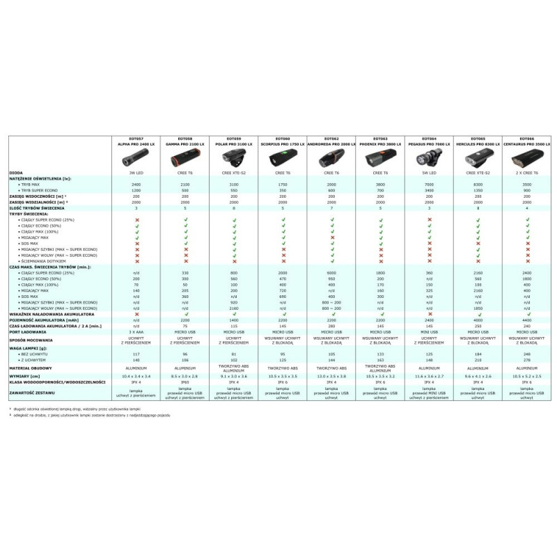 Esperanza HERCULES PRO 8300 LX on professionaalne, veekindel jalgrattalamp, mis paistab silma oma võimsuse ja funktsionaalsusega. Varustatud kahe võimsa Cree T6 LED-dioodiga, kiirgab see intensiivset valgust, mille tugevus on MAX-režiimis 8300 luksi, pakkudes eredat ja ühtlast valgustust kuni 200 meetri kaugusele. Tänu nähtavusele üle 2000 meetri tagab lamp maksimaalse ohutuse nii öistel sõitudel kui ka maastikuseiklustel.