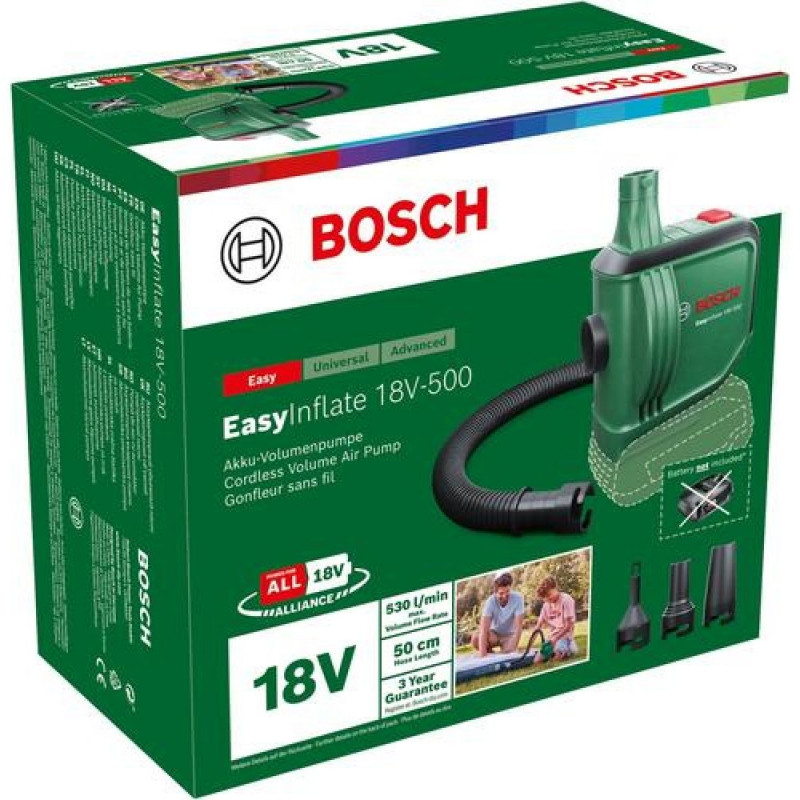 <br />Bosch EasyInflate 18V-500. Proper use: Universal, Pump pressure: 0.03 bar, Airflow: 530 l/min. Power source type: Battery, Battery technology: Lithium-Ion (Li-Ion). Width: 119 mm, Depth: 236 mm, Height: 195 mm. Package type: Box
