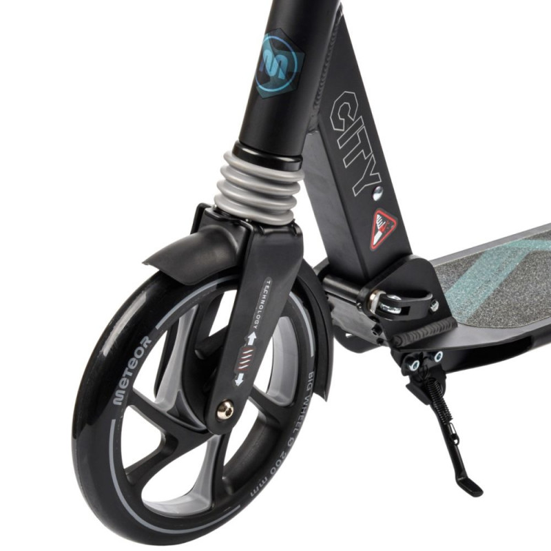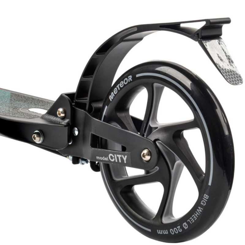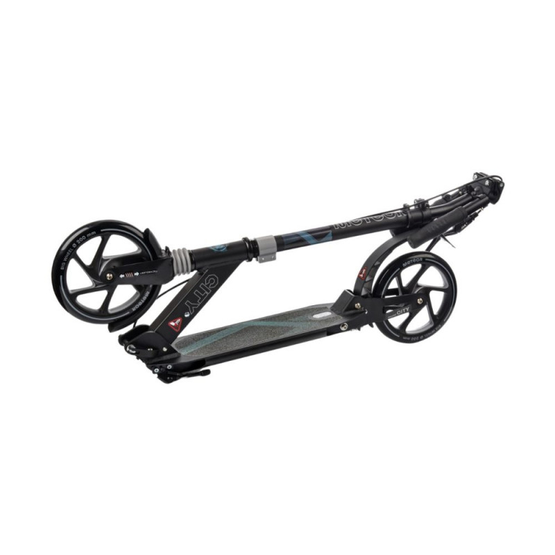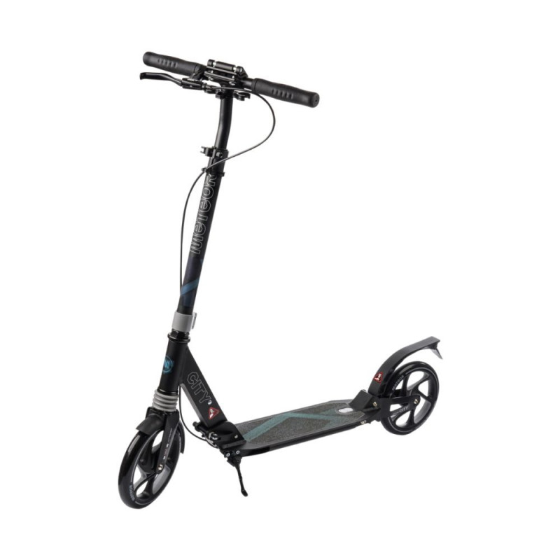 Hulajnoga Meteor została stworzona z myślą o jeździe po różnych nawierzchniach. Wyróżnia się trwałością za sprawą aluminiowej konstrukcji i stalowych śrub. Przedni amortyzator oraz kierownica z ergonomicznymi, gumowymi rączkami amortyzują wstrząsy. 3-stopniowa regulacja wysokości kierownicy. Bardzo duże koła. Błotniki zabezpieczające przed ochlapaniem, abłotnik na tylnym kole posłuży jako hamulec. Dodatkowo model wyposażony w hamulec ręczny. Składana konstrukcja. Niski, duży podest. Antykorozyjne właściwości.
