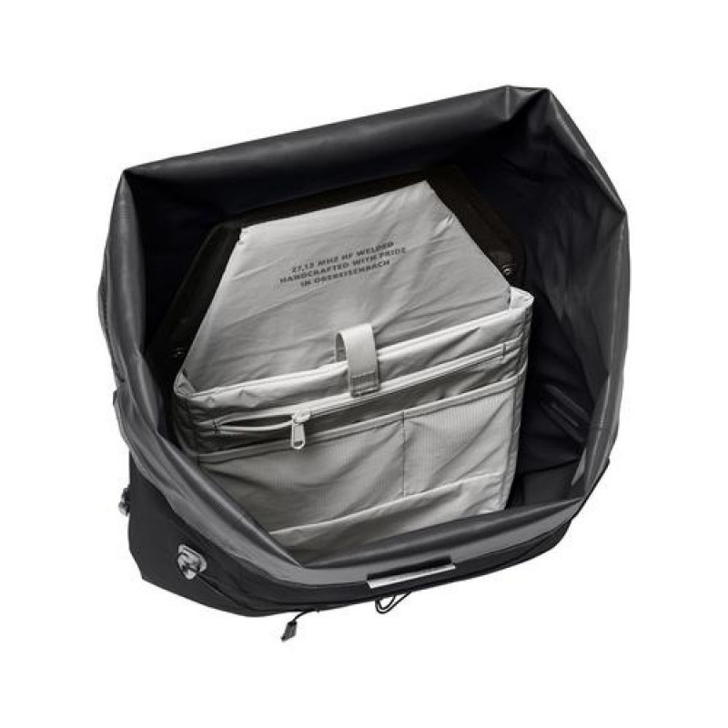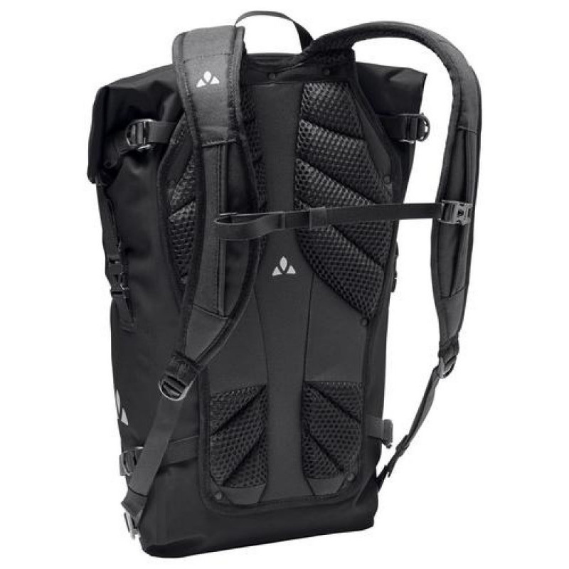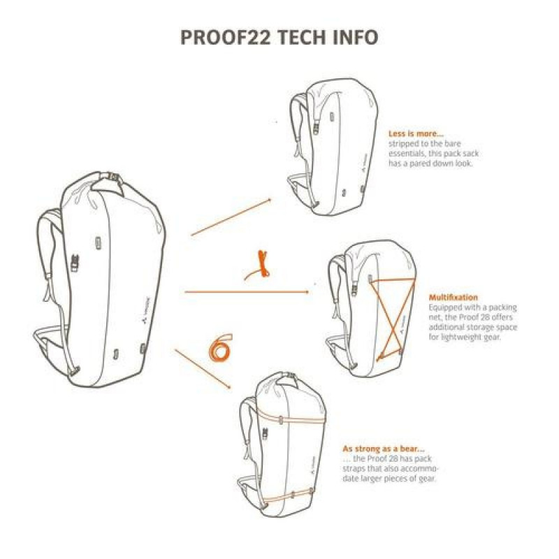 Proof – the name says it all! This waterproof backpack in a no-frills design is a true all-rounder for city, bike, trail and mountain – in any weather! For smaller people or when carrying a heavier load, the comfortable Ergoshape shoulder straps and strategically placed back padding offer a stable fit even without a hip belt. Compression straps at the bottom and top help you to secure your load depending on the pack volume. The foolproof roll closure can be snugged down at the side or clipped together at the top, providing quick access to the main compartment. There's a padded compartment for laptops up to 13.3" inside at the back as well as one zip and one slide-in compartment for securing small items. A waterproof hf-welded slide-in pocket at the front holds a protein bar, map or your GPS. In addition, 4 integrated multi-purpose straps included in delivery can hold extra gear like a helmet, jacket or make a good place to store wet clothing. Reflective logo prints are located at the front and sides for extra visibility in the dark. The extremely abrasion-resistant, bluesign®-certified primary material consists of 68% recycled Econyl. The Proof 22 is made with fully waterproof, hf welding with eco-friendly manufacturing at the company's headquarters in Germany.<br>VAUDE Proof 22. Backpack type: Cycling backpack, Product main colour: Black, Style: Sport. Width: 480 mm, Depth: 330 mm, Height: 210 mm. Quantity per box: 1 pc(s)