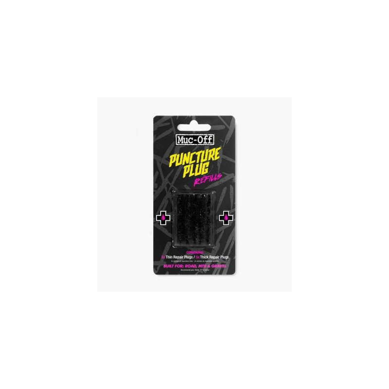 A handy refill pack for your puncture plug tool, each pack contains 5 thin plugs and 5 thick plugs.<br>Compatible with all tubeless road, MTB and gravel tyres. Refill packs with 10 repair plugs (5x thin and 5x thick).Muc-Off 492-039-720132. Product type: Repair patch, Recommended usages: Tire, Tubeless tire, Suitable for bicycles: City bicycle, Mountain bicycle, Road bicycle. Quantity per pack: 10 pc(s), Package type: Blister