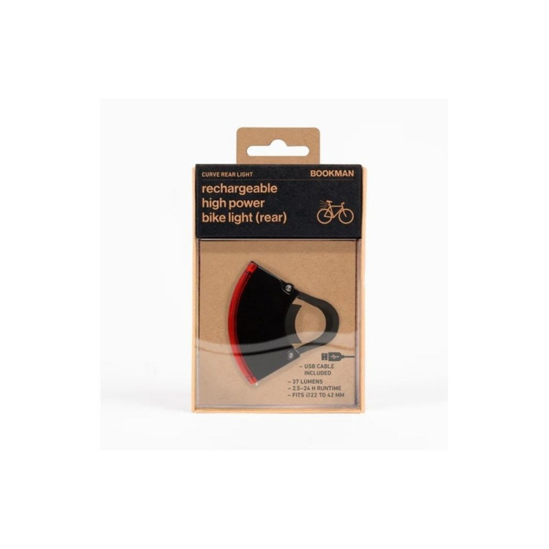 BOOKMAN Curve tagumine rattatuli on punase ja musta disainiga, lihtsasti paigaldatava klambrikinnitusega ning töötab kuni 32 tundi, pakkudes eredust 37 luumenit. Tuli töötab 650 mAh mahutavusega liitiumioonakuga ning sellel on aku tühjenemise indikaator.