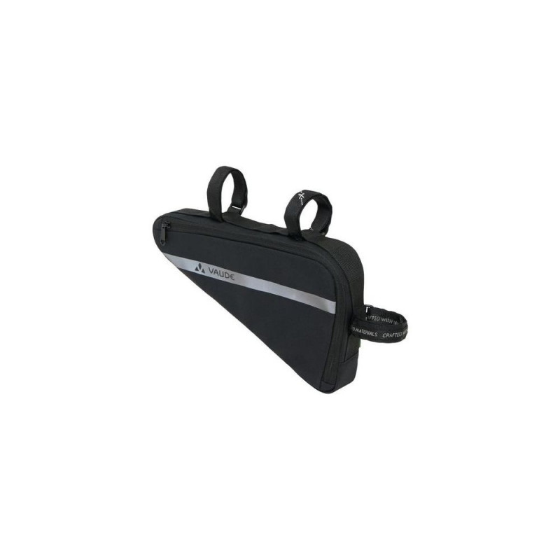 The triangular Frame Bag L, with a 1.7-liter capacity, securely stores tools, a mini pump, energy bars, and a windbreaker. It features a small interior mesh pocket and a slim outer zipper pocket for convenient organization of small items. This frame bag is easily attached between the top tube and seat tube with 3 Velcro straps and comes with an all-around reflective print for increased visibility. The VAUDE Green Shape label stands for environmentally-friendly, functional products made from sustainable materials.VAUDE Frame bag bike L. Mounting type: Frame, Type: Bicycle bag, Material: Polyamide. Width: 310 mm, Depth: 60 mm, Height: 180 mm