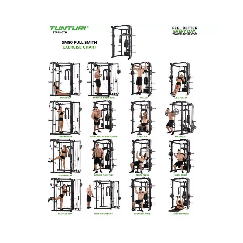 Jõupink TUNTURI SMITHI SM80 Tunturi SM80 täismõõdus Smithi kodujõusaalil on kõik, mida vajate täiskere treeninguks! Ideaalne, kui soovite kodus treenida, kuid samuti suurepärane ja täielik varustus jõusaalile või taastusravikeskusele.