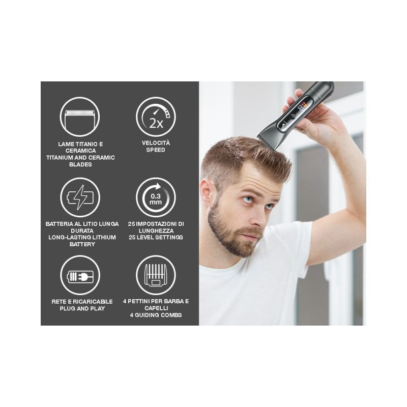 Laetav juukselõikur 0,3 mm tera reguleerimisulatuse ja kahe kiirustasemega, et tagada maksimaalne täpsus iga habeme ja soengu puhul. Juhtmega ja laetav töö pika tööeaga liitiumioonaku, mille aku tööiga on 3 tundi. Fikseeritud terasest terad titaankattega ja liikuvad keraamilised terad. LED-ekraan aku oleku indikaatoriga, kiiruse, klahvilukuga juhusliku sisselülitamise vältimiseks ja laadimissignaaliga. Varustatud 4 trimmerikammiga erinevate lõikepikkuste jaoks. Komplektis on USB-C-tüüpi laadimiskaabel, puhastushari ja määrdeõli.