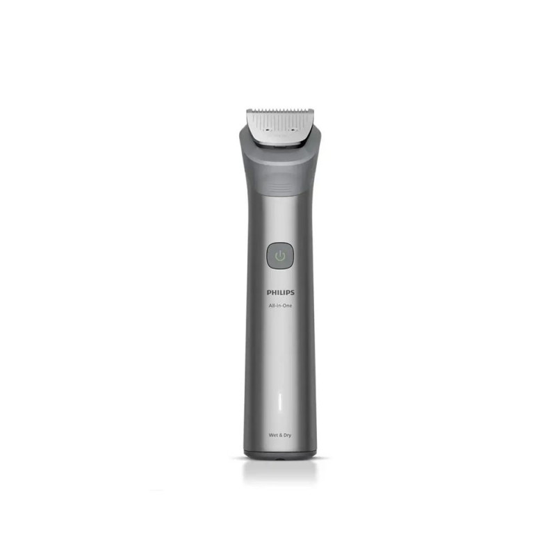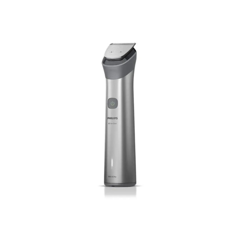 The Philips All-in-One Trimmer 5000 Series MG5941/15 is a versatile grooming tool offering 11 attachments for comprehensive styling of face, hair, and body. Equipped with self-sharpening steel blades and 13 length settings ranging from 0.5 mm to 16 mm, it ensures precise and customized trimming. The trimmer is waterproof, allowing for convenient use in both dry and wet conditions.