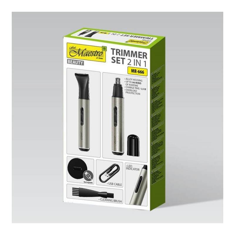 Maestro MR-666 2-ühes USB-C trimmerikomplekt on äärmiselt praktiline komplekt, mis sisaldab kahte tüüpi trimmereid: ninatrimmerit ja juuksetrimmerit. Need aitavad sul alati hoolitsetud välja näha.