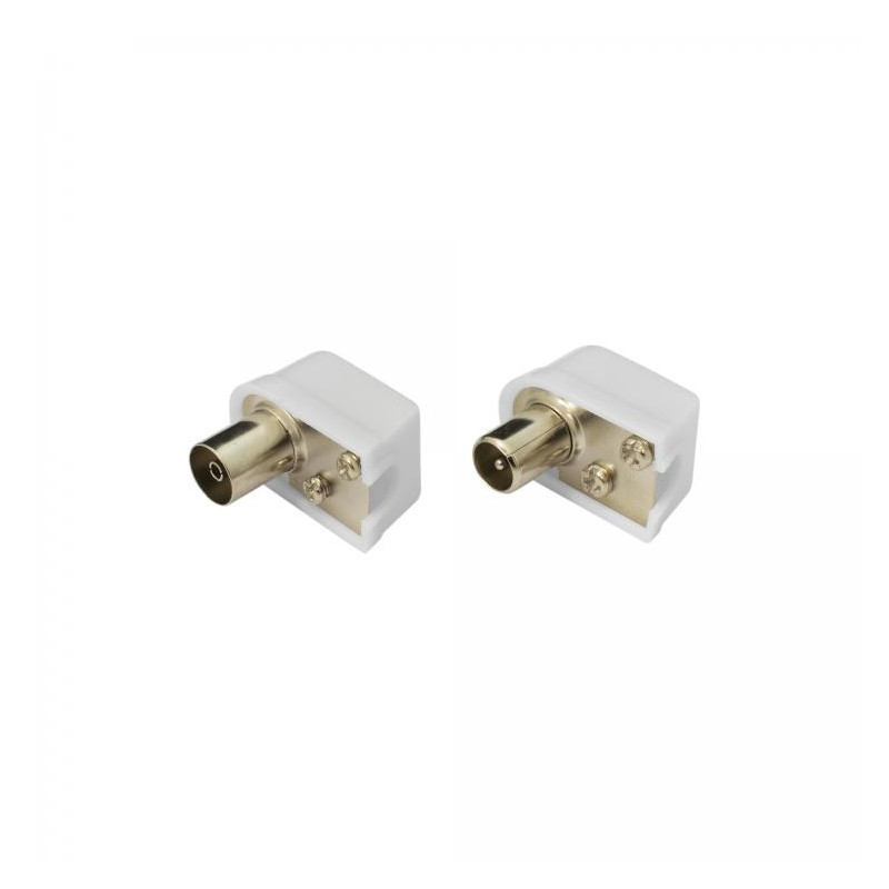 Koaksiaalühendus RF-M + RF-F 90 ° nurk Materjal: tsink Takistus: 75ohm Pistiku mõõdud: 9,5mm Värv: valge Toote kaal: 0,012 kg Kogumass: 0,014 Pakendi mõõdud: 8 x 12 x 1,5 cm
