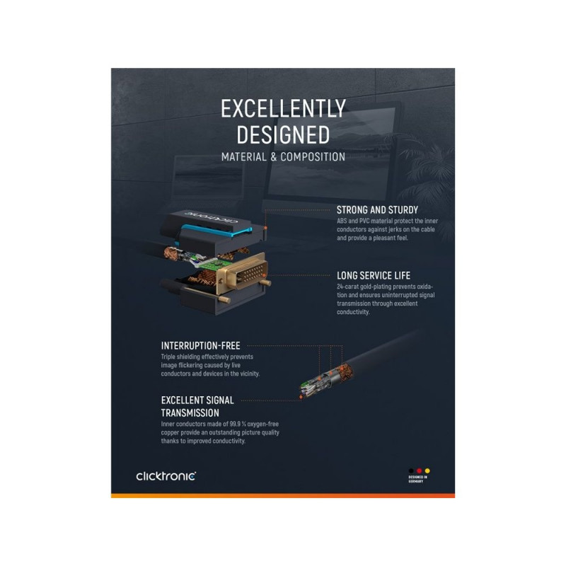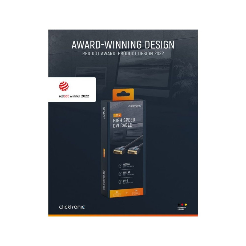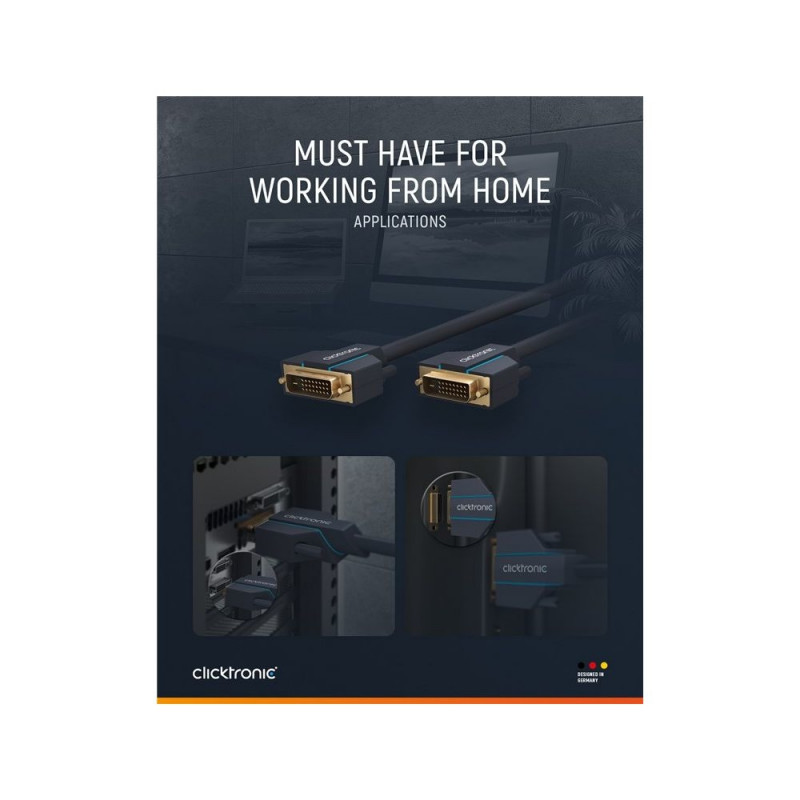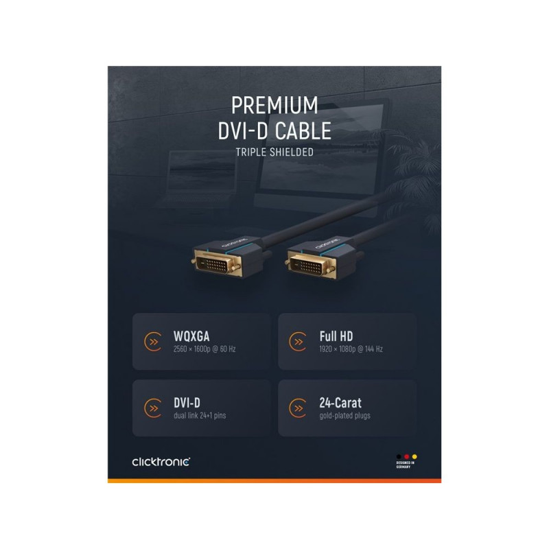 ClickTronic HQ OFC kabel DVI-D(24+1) male <> DVI-D(24+1) male, Dual Link, 20m DVI Dual Link; DVI-D plug <> DVI-D plug 24+1 DVI-D connection cable (DVI-D plug/DVI-D plug)(24+1pin) 7,5 m video cable for HD signals up to QXGA / FullHD 7,5 m video cable for HD signals up to WQXGA / FullHD Let your computer games and multimedia applications show their full potential: digital, clear and with high resolution. Thanks to a multiple layers of signal shielding, pure materials, and precise processing, this cable transmits the graphics of your computer or your game console without any loss to monitors and HD TVs (Full HD 1080p). So you can be that your experience is genuine. - digital video / monitor cable with DVI-D connector (dual link) - pure copper conductor and 2-way shielding for clear signal quality - supports a maximum resolution of up to 2560 x 1600 (WQXGA) - 24 carat gold-plated contacts for minimum transmission resistance Plug material: triple-coated PVC / ABS Port 1, type: DVI-D connector (24 + 1 pin) Port 2, type: DVI-D connector (24 + 1 pin) Type: Round cable Length (m): 20 Inner conductor material: OFC (Oxygen free copper) AWG: 24 Number of shieldings: 2 x Type of 1st shielding Aluminium foil Type of 2nd shielding Cu braid 160 wires x 0,1mm Outer sheath diameter (mm): 10,5