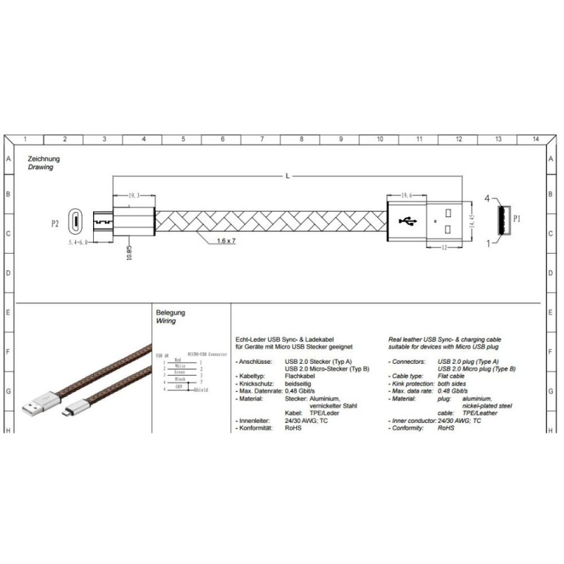 Micro-USB Real leather sync and charging cable - Suitable for devices with a Micro-USB port high-quality real leather cable with metal connectors, flat cable prevents knots cable length of 1.0 m for sufficient reach USB 2.0 cable for synchronising and charging Hi-speed data transfers of up to 480 Mbps particularly suitable for use in the car Technical Data Connections Connection, housing material aluminum Connection, type USB 2.0 plug (type A) Connection 2, type USB 2.0 micro plug (type B) Cable Cable type flat cable Cable length 1 m Signal transmission max. transmission rate 0.48 Gbit/s General Color brown, black, silver