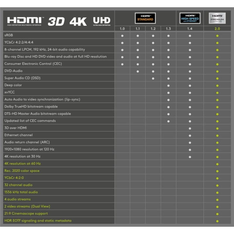 PremiumCord High Speed HDMI 2.0b cable with Ethernet , 2m, gold plated - HDMI 2.0b High Speed + Ethernet cable - Maxi.resolution 4K×2K@60hz - Max. transfer rate : 18 Gb/s - Gold plated connectors - Metal connectors - Supported resolutions: up 3840 × 2160 pixels non-interlaced, or lower 1080p FULL HD/1080i/720p/720i - Support HDMI 2.0b a lower - HDR (High Dynamic Range) - Support 4K, Deep Color, 3D, xvYCC (xvColor), auto lip-sync, ARC, CEC, HDCP, Dolby TrueHD, HEC - 3D – Defines input/output protocols for major 3D video formats, paving the way for true 3D gaming and 3D home theater applications - 4K Support – Enables video resolutions far beyond 1080p, supporting next-generation displays that will rival the Digital Cinema systems used in many commercial movie theatres - Audio Return Channel – Allows an HDMI-connected TV with a built-in tuner to send audio data "upstream" to a surround audio system, eliminating the need for a separate audio cable - Three layer high density shielded - 24bit deep colors - HDMI Ethernet Channel – Adds high-speed networking to an HDMI link, allowing users to take full advantage of their IP-enabled devices without a separate Ethernet cable - Colour: gold-black - HDMI type A (19pin) plug <=> HDMI type A (19pin) plug , - COPPER 19-wire cable, double shielded, AWG30 - 1m length