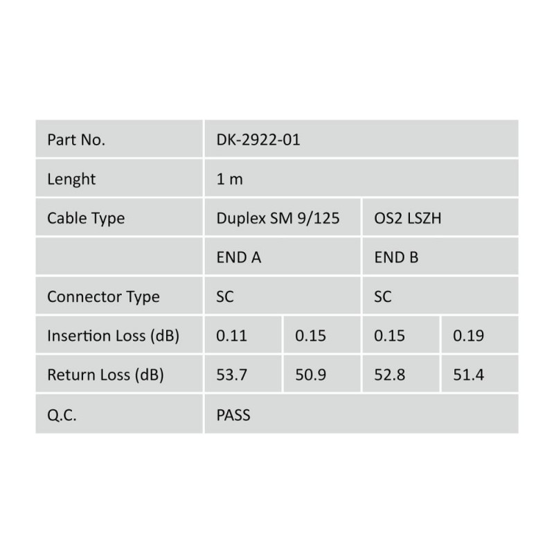 DIGITUS Fiber Optic Patch Cord, SC to SC Singlemode 09/125 µ, Duplex Length 1m Article number: DK-2922-01 EAN: 4016032248736 Description: • SC / SC Connector • Connector with ceramic ferrule • Singlemode • Duplex • I-VH 2E9/125µ • Halogen free cable • 9/125µm fiber • Fiber class OS 2 • Cable diameter 3mm • Cable color yellow • Single packed, with test report