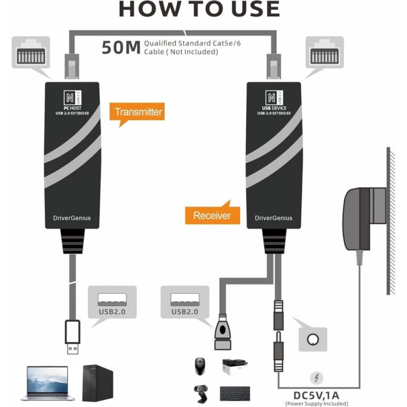 USB 2.0 Extender Adapter 50Meters, USB Extender The USB 2.0 Extreme extenders represent a significant milestone in the USB market supporting USB 2.0 peripheral devices at speeds up to 480 Mb/s . Powered by Extreme USB technology, the USB 2.0 supports a single device port. These USB extenders require AC power (included) at the Remote Extender (REX) end. Additionally an optional the Local Extender (LEX) power supply is available for USB ports that cannot provide the required 500mA current. This USB extender allows you to conquer the 5 Meter USB length limitation. Using inexpensive network cables, this extender provides the simplest and most economic way to extend the distance of a USB device up to 150ft. Now you can place your USB cameras, printers, web cams, storages, keyboard/mouse extensions or other USB device exactly where you want it. - Transmits USB signals via network cable up to 50 m - Extends USB 2.0 high-speed and USB 1.1 (low-speed, full speed) devices up to 50m over Cat 5 cable by 480Mbps - Supports most of the USB device types: Control, Interrupt, Bulk and Isochronous at up to 480Mbps. - Supports connecting up to 4 Usb devices over a Usb2.0 4 Port Hub. - Uses standard Cat5/Cat5E/Cat6 patch cord (not included). - AC power (included) is required at the remote REX end - Optional LEX power supply is available for USB ports that do not supply 500mA current - Ideal for a wide variety of USB devices, from printers, web cams, and hard drives, to cell phones, iPods, digital cameras and game controllers. Package Content: - 1 x the Local Extender (LEX) USB Type A Male, RJ45 Female - 1 x the Remote Extender (REX) USB Type A Female, RJ45 Female, DC Port - 1 x Power Adapter System Requirements: - USB2.0 Port - Windows XP, Windows Vista, Windows 7