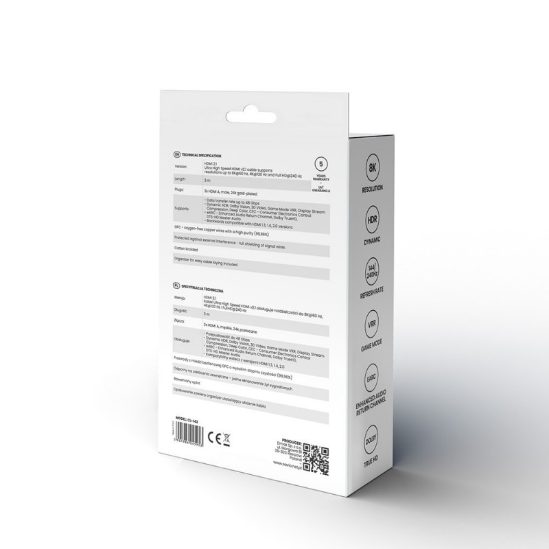 | Other features | Version: 2.1 Support refresh rate 240Hz and 144Hz at FULLHD and 120Hz at 8K Support high resolutions up to 8K@120Hz (7680×4320) Support Dynamic HDR, HDR 10 i Game Mode VRR Standard: High Speed HDMI Cable with Ethernet Ethernet support up to 100 Mb / sec. |