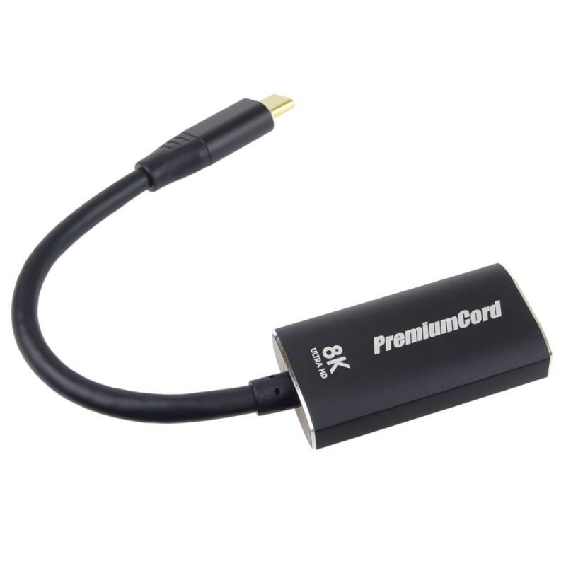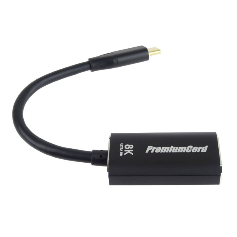 PremiumCord adapter USB-C male to DisplayPort DP1.4 8K@60Hz male The adapter with the latest DP1.4 specification comes, supports resolutions up to 8K@60Hz with HDCP 2.2, allows you to connect and display on the latest monitors or TVs in ultra HD 8K@60Hz resolution - USB-C to DisplayPort 1.4 adapter - Resolution up to 8K@60Hz (7680x3840@60Hz), 4K@120Hz and also FULL HD 1080p - Supports HDCP2.2 - This adapter allows you to connect a USB-C computer or smartphone to a DisplayPort-enabled HDTV, monitor or projector for big-screen viewing. - This adapter has been professionally tested and inspected. - It is compatible with the USB-C specification and intended for devices supporting DisplayPort Alternate modes - Widely used for laptops, tablets and smartphones. - Double-sided type C connectors, which you can plug in at will and on both sides. - Aluminum housing and connector - Color: metallic gray, cable color: black - Cable length: 15cm - Works with new USB-C devices supporting DisplayPort Alternate modes
