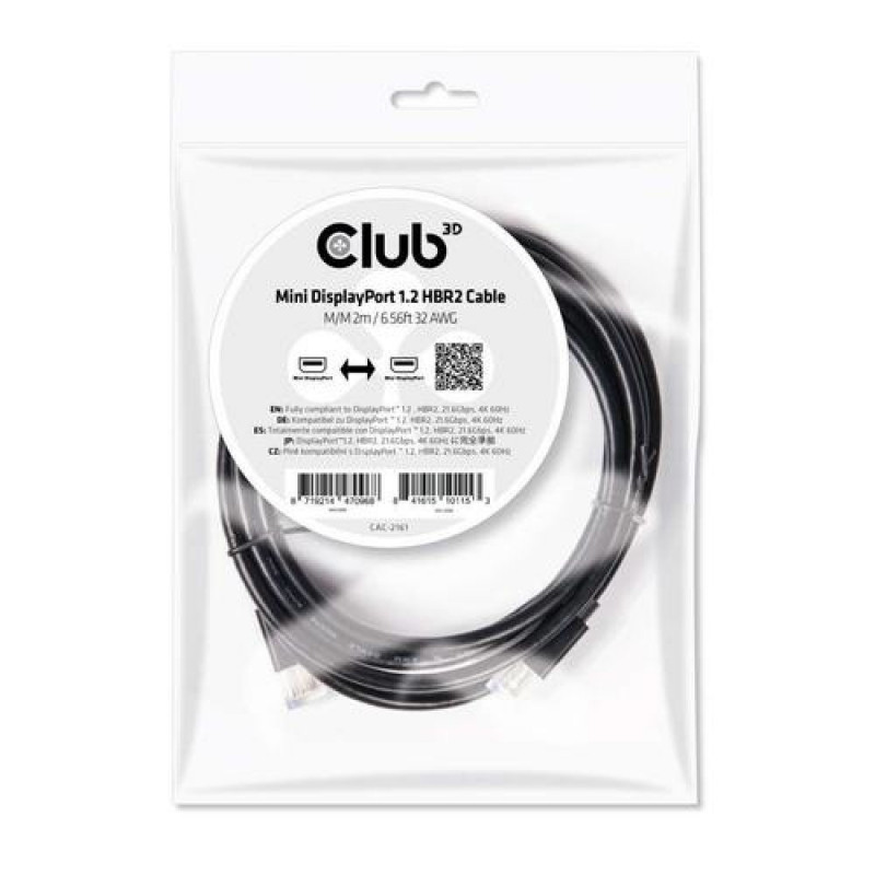 CAC-2161 - The Club 3D Mini DisplayPort™ cable enables the connection of your Mini DisplayPort™ supported (Gaming) PC or Laptop to an Ultra High Resolution Monitor or other Mini DisplayPort™ supported device.<br>The Club 3D CAC-2161 is fully compatible to Displayport™ 1.2 specifications and is downwards compatible to earlier versions.<br><br>The soft UltraFlex jacket protects the cable from bending- and deformation damage.CLUB3D Mini DisplayPort 1.2 HBR2 Cable M/M 2m/6.56ft 4K60Hz. Cable length: 2 m, Connector 1: Mini DisplayPort, Connector 2: Mini DisplayPort. Weight: 70 g, Quantity per pack: 1 pc(s), Package width: 150 mm. Products per master (outer) case: 10 pc(s)