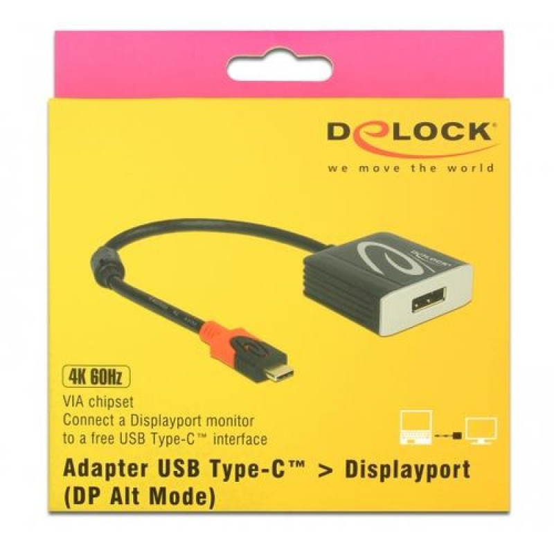 <b>Description</b><br>This adapter by Delock is suitable for the connection of a Displayport monitor to a computer with USB-C™ interface and Displayport alternate mode support. Thus, the adapter can be connected to different laptops like MacBook, Chromebook and similar. In addition, the adapter can also be operated on a Thunderbolt™ 3 interface.DeLOCK 63312. Maximum resolution: 4096 x 2160 pixels, Supported video modes: 1080p, Chipset: VIA VL100. Product colour: Black