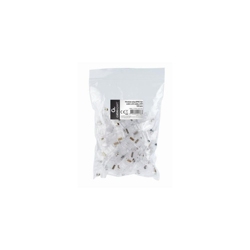 Modular 8P8C RJ45 plug, CAT5e<br> 30u'' gold plated<br> 3-fork internal contacts for use with solid LAN cablesGembird LC-8P8C-001/100. Connector(s): 8P8C (RJ-45), Product colour: Transparent, Cable standard: Cat5. Compliance certificates: RoHS. Weight: 2 g, Width: 12 mm, Depth: 25 mm. Quantity per pack: 100 pc(s), Package width: 115 mm, Package depth: 140 mm