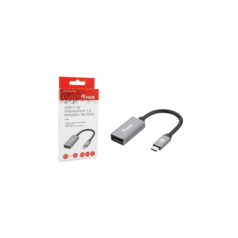 The equip® USB-C to DisplayPort 1.4 adapter is a device that allows you to connect a USB-C device, such as a laptop or smartphone, to a display that supports DisplayPort 1.4. This adapter supports high resolution and refresh rates, with a maximum resolution of 8K/30Hz. <br><br>The adapter can transmit both video and audio signals, and supports HDCP 2.2 content protection. It is a convenient solution for users who want to connect their USB-C devices to a DisplayPort monitor or TV, and is especially useful for tasks that require high resolution and fast refresh rates, such as gaming, video editing, and graphic design.<br><br>By supporting a maximum bandwidth of 32.4 Gbps, content up to 8K Ultra HD (7680 x 4320/30Hz) resolution can be displayed.Equip USB-C to DisplayPort 1.4 Adapter, 8K/30Hz. Cable length: 0.15 m, Connector 1: USB Type-C, Connector 2: DisplayPort. Compliance certificates: RoHS, CE. Weight: 30 g, Width: 10 mm, Depth: 200 mm. Package width: 23 mm, Package depth: 75 mm, Package height: 148 mm. Quantity per pack: 1 pc(s)
