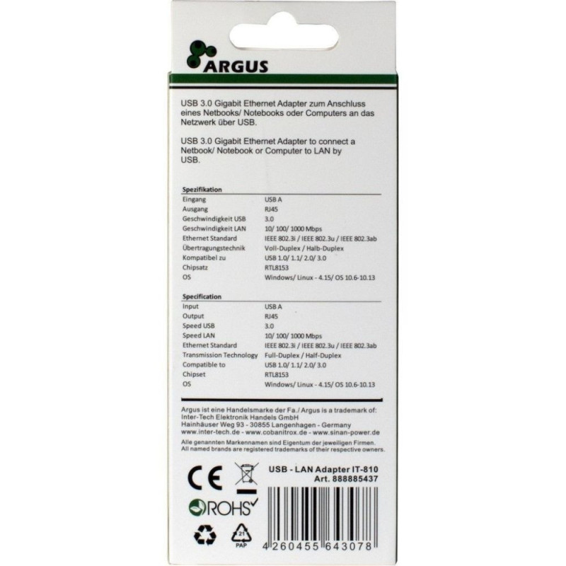 Inter-Tech ARGUS IT-810. Toote värvus: must. Kiibistik: Realtek RTL8153. Laius: 25 mm, sügavus: 240 mm, kõrgus: 17 mm. Pakendi kaal: 50 g. Ühilduvad operatsioonisüsteemid: Windows 7, 8, 8.1, 10, Linux, Mac 10.6