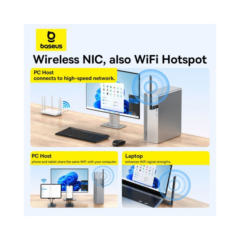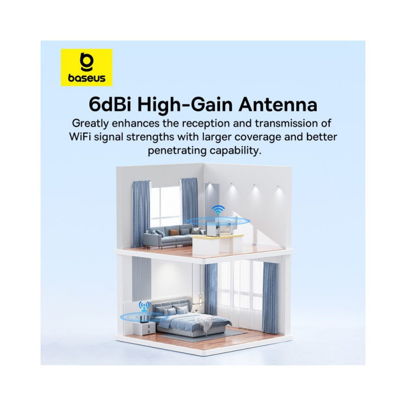 USB võrgukaardil Baseus BS-OH172 on võimendatud antenn, mis tagab andmeedastuse kiirusega 300 Mb/s. Toetab ühendust 2,4 GHz sagedusribal. Töötab arvutitega, millel on installitud Linux või Windows. Antenn pakub kõrget energiakasutust - 6 dBi.