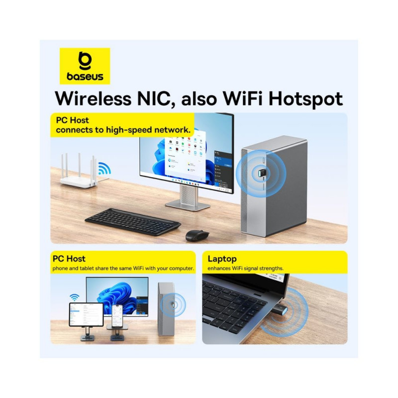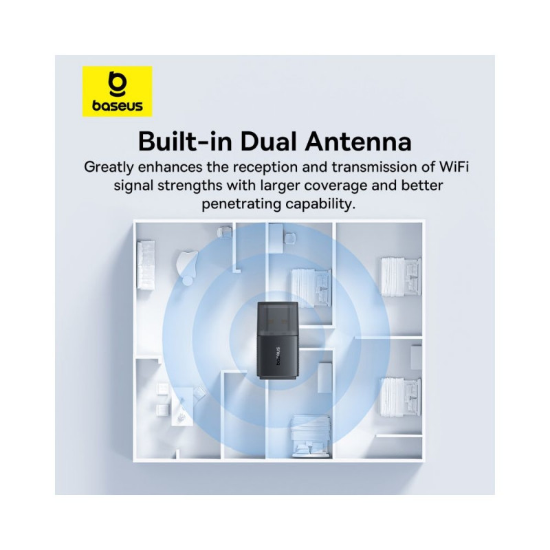 Baseus BS-OH169 USB võrgukaart toetab traadita ühendust kuni 20 dBm võimsusega. See võimaldab andmete edastamist kuni 300 Mb/s sagedusalas 2,4 GHz. Tänu väikestele mõõtmetele ja kergele kaalule mahub adapter seljakotti, kotti või käekotti. See on ühilduv mis tahes Linuxi või Windowsi operatsioonisüsteemiga arvutiga.