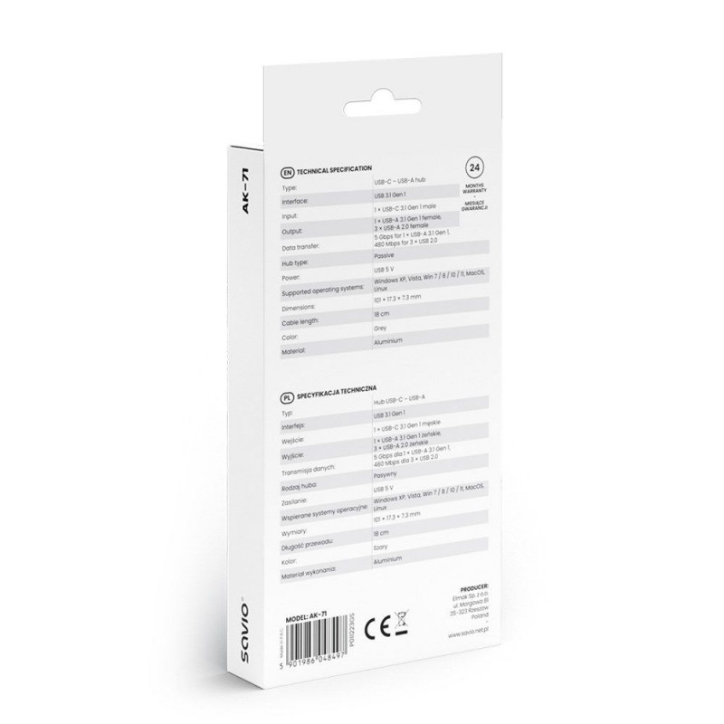 SAVIO AK-71 USB-C jaotur - 3 x USB-A 2.0, 1 x USB-A 3.0, 4-ühes, 5 Gbps