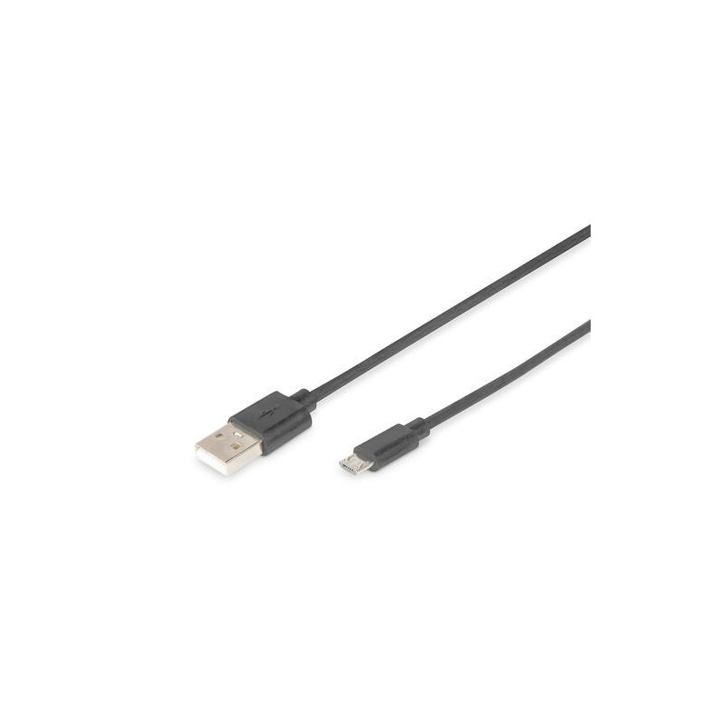 Use external devices with a Micro USB connection - Compatible with USB 2.0 (Hi-Speed) for rapid data transmission<br><br>- USB connection cable USB A to Micro B (Micro USB)<br>- USB 2.0 compatible with high-speed data transmission up to 480 Mbit/s<br>- To connect any devices with a Micro B connection to a PC or charging device<br>- Compatible with all USB 2.0 connections<br>- Downward compatible with USB 1.1<br>- Sturdy cable for excellent durability<br><br>Connect your devices with a Micro USB connection to a PC or charging device. The USB 2.0 features are supported with data transmission of up to 480 Mbps for rapid copying of videos, music or data. Suitable for smartphones, tablets or other peripheral equipment with a Micro USB (Micro B) plug. The cable can also be used to charge your devices with a Micro B jack.Digitus USB 2.0 connection cable - USB A - Micro B. Cable length: 1.8 m. Connector 1: USB A, Connector 2: Micro-USB B, USB version: USB 2.0, Connector gender: Male/Male, Maximum data transfer rate: 0.48 Gbit/s, Connector contacts plating: Nickel, Product colour: Black