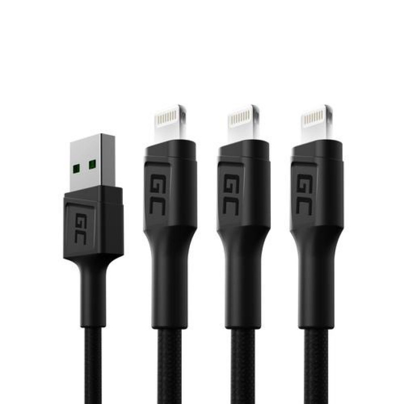 Set of three GC Ray USB-A - Lightning cables with a length of 200 cm - quick charging, fast data transfer and high durability in three different versions for maximum convenience of use<br>The delicate, white illumination of the Lightning plugs with the LED diode will allow you to connect GC Ray to your device without any problems regardless of the season or the prevailing conditions. Forget about looking for cables in the dark!<br>Thanks to the support for Apple 2.4A fast charging and 480Mps data transfer cable is perfect for your modern devices equipped with Lightning port<br>Durable in every inch - the entire length of the cables are protected by the use of durable and modern materialsGreen Cell KABGCSET06. Cable length: 2 m, Connector 1: Lightning, Connector 2: USB A. Output current (max): 2.4 A. Quantity per pack: 3 pc(s)