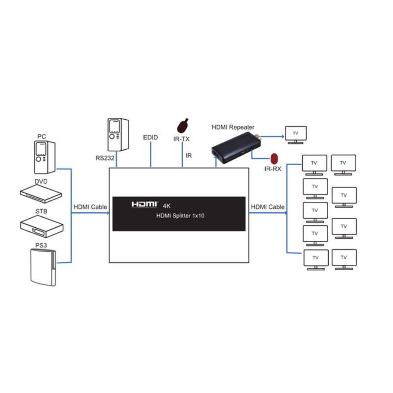 - Võimaldab ühte HDMI seadet jagada hõlpsasti 10 HDMI-ühilduva monitori või projektori vahel.