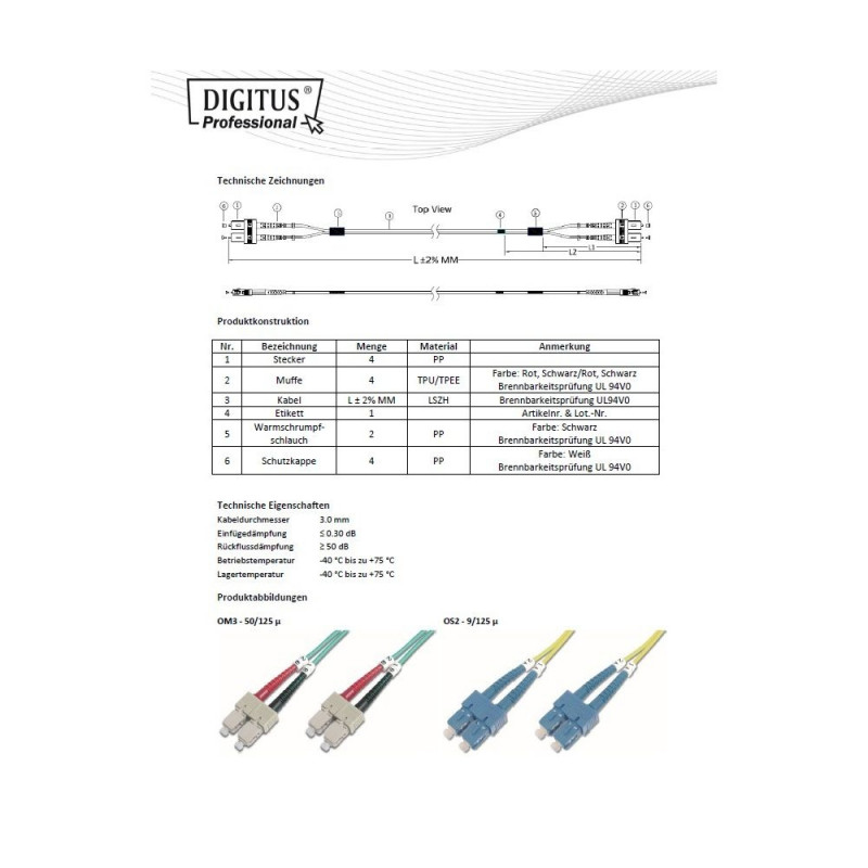 DIGITUS Fiber Optic Patch Cord, SC/SC Multimode 50/125 µ, OM3, Duplex, 1m Best performance and link quality for your network. Duplex cable LSOH Connector with ceramic ferrule Cable diameter 3 mm Single packed with test-report Connector 1: SC Connector 2: SC Cable type: I-VH 2G50/125µ Fiber class: OM3 Mode: Multimode Color cable: aqua color Boot: single-color Fiber diameter: 50/125µ Packaging: DIGITUS Polybag Length: 1m