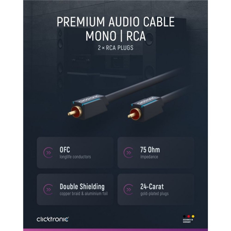 ClickTronic HQ OFC 1xCINCH - 1xCINCH connection cable, M/M, 7.5m Using a 75 Ohm defined wave impedance the video cable provides a reliable connection of DVD Players, TV sets, or Receivers. Due to multiple signal shielding, pure materials, and precise workmanship this cable transmits any video signal with low loss, color fidelity, and clarity. -75 Ohm defined characteristic impedance - pure copper conductor and 2-way shielding for clear signal quality -24 carat gold-plated contacts for minimum transmission resistance Plug material: triple-coated PVC / ABS Port 1, type: RCA plug Port 2, type: RCA plug Type: Round cable Length (m): 7.5 Inner conductor material: OFC (Oxygen free copper) AWG: 22 Number of shieldings: 2 x Type of 1st shielding Aluminium foil Type of 2nd shielding Cu braid 112 wires x 0.12mm Outer sheath diameter (mm): 6