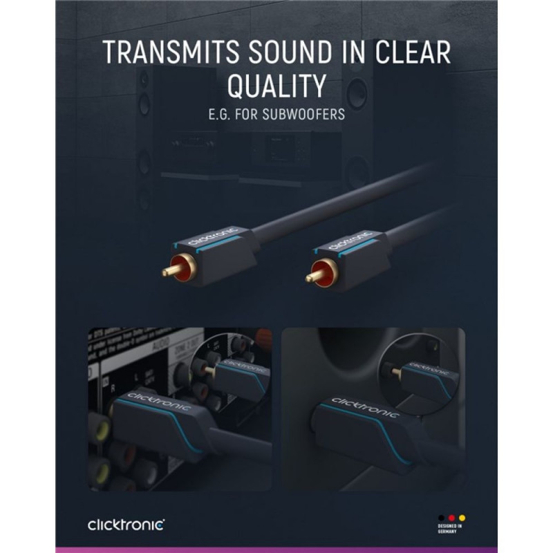 ClickTronic HQ OFC 1xCINCH - 1xCINCH connection cable, M/M, 7.5m Using a 75 Ohm defined wave impedance the video cable provides a reliable connection of DVD Players, TV sets, or Receivers. Due to multiple signal shielding, pure materials, and precisOsta kohe, viimased eksemplarid laos!