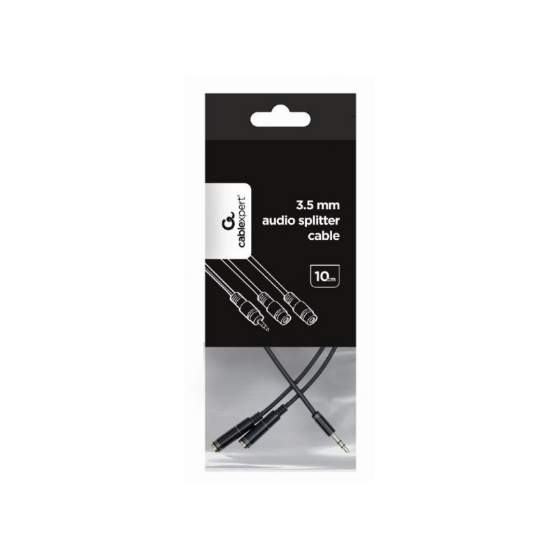 The Gembird CCA-415-0.1M is a 0.1-meter audio splitter featuring a 3.5 mm stereo male plug and two 3.5 mm stereo female sockets. It is designed to connect two pairs of headphones or other audio devices simultaneously to a single audio source, allowing you to share music with another person without compromising sound quality. The cable comes in black and has a compact size, making it convenient for use in various situations.