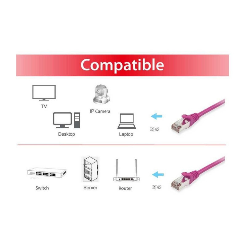 Kaabli mõlemad otsad on varustatud kvaliteetsete RJ45 pistikutega, mis tagavad kindla ja turvalise ühenduse. Violetne värvus muudab selle hõlpsasti eristatavaks teiste kaablite seast, aidates kaasa paremale kaabelduse korraldusele ja visuaalsele eristamisele. LSZH (Low Smoke Zero Halogen) mantliga kaabel on ohutu kasutada ka avalikes ja tihedalt asustatud ruumides, kuna see ei eralda põlemisel mürgiseid gaase ega suitsu, vähendades tulekahju korral terviseriske ja võimalikke kahjustusi seadmetele.