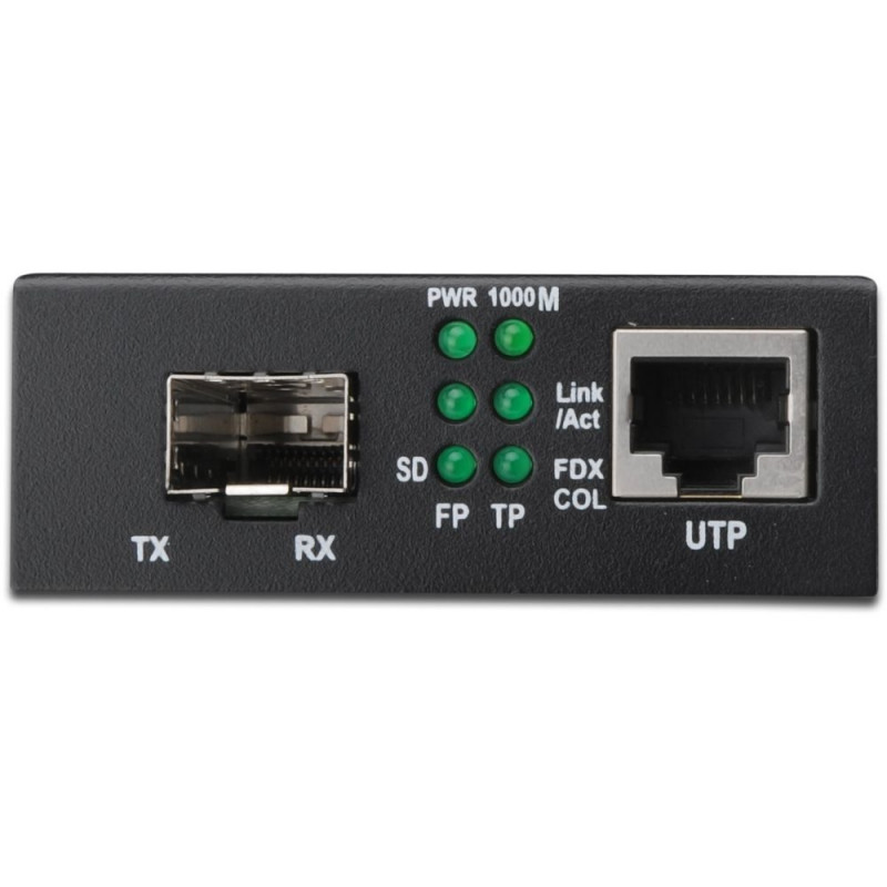 Digitus Gigabit meediamuundur, RJ45 / SFP. Maksimaalne andmeedastuskiirus: 1000 Mbit/s, võrgustandard: IEEE 802.3, IEEE 802.3u, IEEE 802.3z, Etherneti liidese tüüp: Gigabit Ethernet. Maksimaalne võimalik edastuskaugus: 80 000 m, puhvri suurus: 2048 KB. Toote värvus: must. Optiline kaabliühendus: SFP, edastustehnoloogia: juhtmega. Sisendpinge: 5 V.