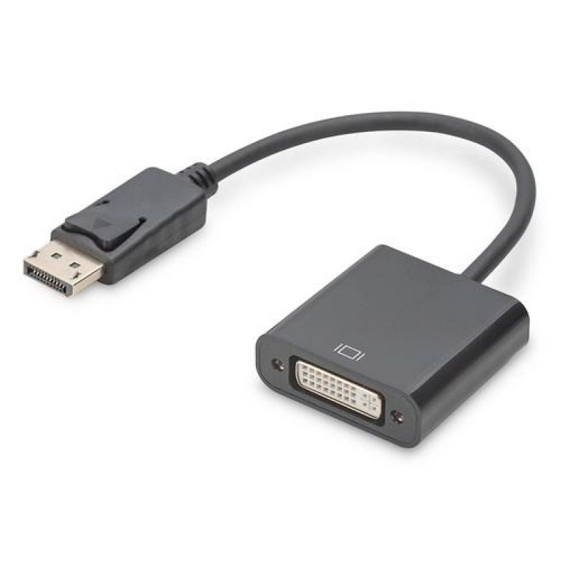 Converts DisplayPort signals to DVI signals<br><br>- DisplayPort plug to HDMI jack<br>- Full HD resolution, 1080p / 60 Hz<br>- Built-in preamplifier<br>- Supports data rates of up to 2.25 Gbps<br>- HDCP 1.3 compatible<br>- Deep Color 24bit<br>- DVI 1.0 compatible<br><br>The active DisplayPort Adapter from DIGITUS® converts DisplayPort signals to DVI signals. Resolutions in Full HD (1080p) are supported with frequencies of up to 60 Hz. HDCP 1.3 and 24Bit DeepColor are also supported, as well as DVI 1.0. The installed preamplifier and double shielding ensure first-class transmission qualities to HD display of all kinds. The DVI plug is fully utilized (24+5).Digitus Active DisplayPort Adapter / Converter, DP to DVI. Cable length: 0.15 m, Connector 1: Mini DisplayPort, Connector 2: DVI-I. Package width: 75 mm, Package depth: 230 mm, Package weight: 101.25 g. Quantity per pack: 1 pc(s)