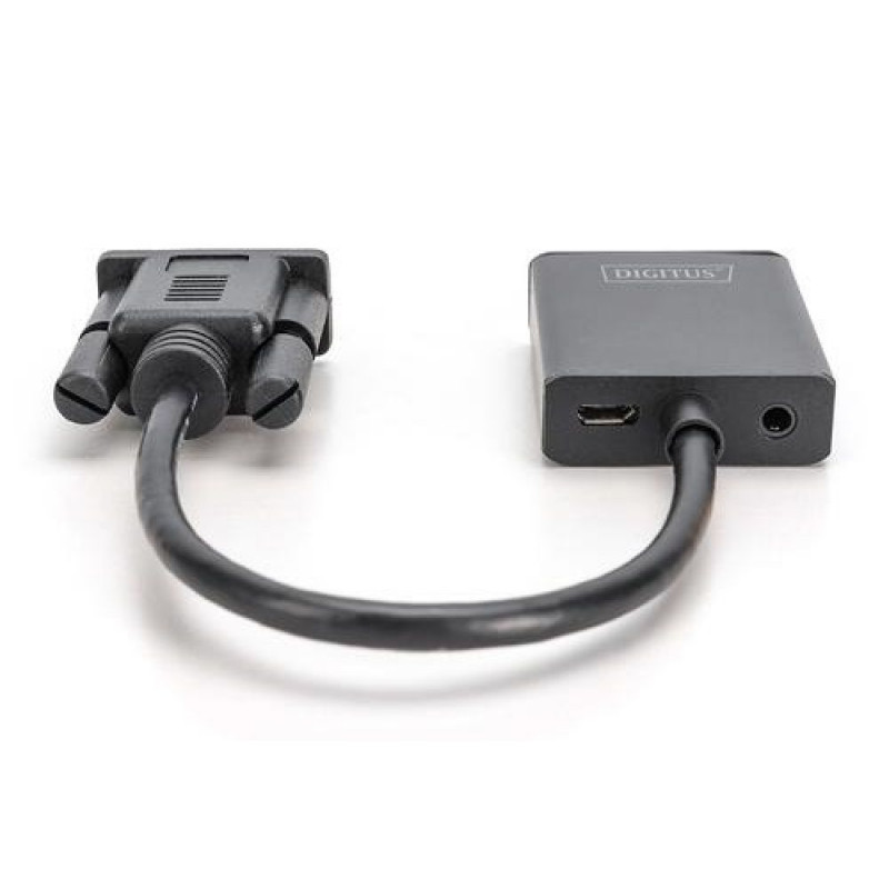 Converts your analog VGA signal to a digital HDMI signal<br><br>- Converts video and audio signals from VGA to HDMI<br>- Connect older devices with a VGA port to TV sets, monitors or projectors with an HDMI port<br>- Additional audio transmission (3.5 mm jack)<br>- Power supply via USB<br>- No software or driver installation is required<br><br>The Digitus VGA to HDMI Converter converts your analog VGA signal to a digital HDMI signal. The conversion enables you to easily connect devices having only a VGA port to an HDMI monitor, a TV set or a projector. The converter is equipped with a 3.5 mm audio jack since the VGA input can play back only a video signal. Any existing stereo signal is simultaneously converted and integrated into the HDMI signal. This makes it possible to play back the audio signals via HMDI on your TV set.Digitus VGA - HDMI Converter. Cable length: 0.15 m, Connector 1: VGA (D-Sub), Maximum resolution: 1920 x 1080 pixels. Weight: 50 g, Width: 45 mm, Depth: 45 mm. Package width: 75 mm, Package depth: 265 mm, Package weight: 143.333 g