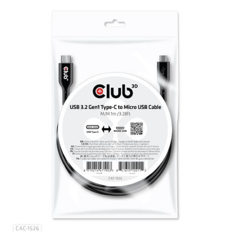 The Club 3D CAC-1526 USB 3.2 Gen1 Type-C to Micro USB Cable enables the connection of your existing USB Type C output connections, Laptops, tablets and Ultrabooks, Power Chargers, etc. to Micro USB inputs, like camera's, Phones and our range of extension cables and adapters.<br><br>The cable is backwards compatible and supports USB 3.0 and USB 2.0 as well. The USB 3.2 Gen1 specification ensures a bitrate of 5Gbps for transfer of large files.CLUB3D USB 3.2 Gen1 Type-C to Micro USB Cable M/M 1m /3.28ft. Cable length: 1 m. Connector 1: USB C, Connector 2: Micro-USB B, USB version: USB 3.2 Gen 1 (3.1 Gen 1), Maximum data transfer rate: 5 Gbit/s, Product colour: Black