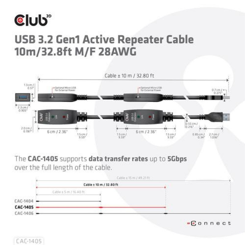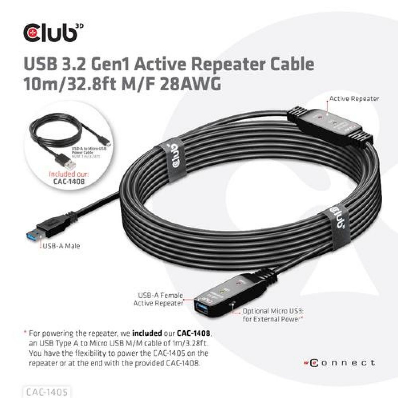 Description:With this Club3D USB 3.2 Gen1 Active Repeater Cable CAC-1405, you can go far beyond the standard USB Cable length limitation of 3 meters /9.84 feet, without loss of Data Transfer Speed. The USB 3.2 Gen1 Active Repeater Cables are fully Plug & Play and do not require any driver installation. Just connect your external USB device like External HDD/NAS/Digital Camera or External USB Graphics to your system with the CAC-1405 and have flexibility of the increased 10 meters of extra cable length. Also for a VR experience at the sofa away from the notebook or PC this cable provides you with the freedom of movement.The CAC-1405 supports data transfer rates up to 5Gbps over the full length of the cable.For powering the repeater, we included our CAC-1408, an USB Type A to Micro USB M/M cable of 1m/3.28ft. You have the flexibility to power the CAC-1405 on the repeater or at the end with the provided CAC-1408.CLUB3D USB 3.2 Gen1 Active Repeater Cable 10m / 32.8ft M/F 28AWG. Cable length: 10 m, Connector 1: USB A, Connector 2: USB A, USB version: USB 3.2 Gen 2 (3.1 Gen 2), Product colour: Black