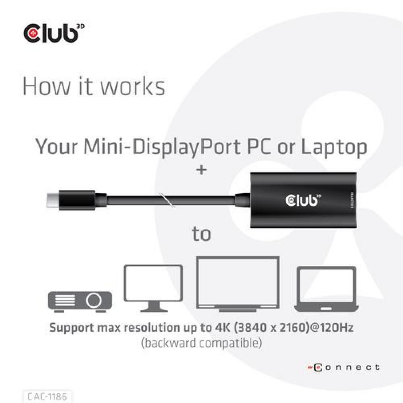 <b>Description:</b><br><br>The Club 3D CAC-1186 is the perfect solution to connect to any HDMI 4K120Hz ready display. When you have a PC with a Mini DisplayPort 1.4 connection or any other device that lacks the new HDMI 4K120Hz specification, the Club3D CAC-1186 will be the simple way to upgrade your device and connect to your new TV. With its DP1.4 DSC1.2 video compression technology, this adapter is able to convert DP1.4 video signals to HDMI , supporting video display resolutions up to 4K (3840 x 2160)@120Hz and creating life like colors and movements with HDR10 giving users the ultimate visual experience. The Adapter is powered thru the Mini DisplayPort connection.CLUB3D Mini DisplayPort 1.4 to HDMI 4K120Hz with DSC1.2 Active Adapter M/F. Cable length: 0.15 m, Connector 1: Mini DisplayPort, Connector 2: HDMI Type A (Standard). Weight: 28 g, Width: 31.5 mm, Depth: 60 mm. Package width: 60 mm, Package depth: 35 mm, Package height: 240 mm