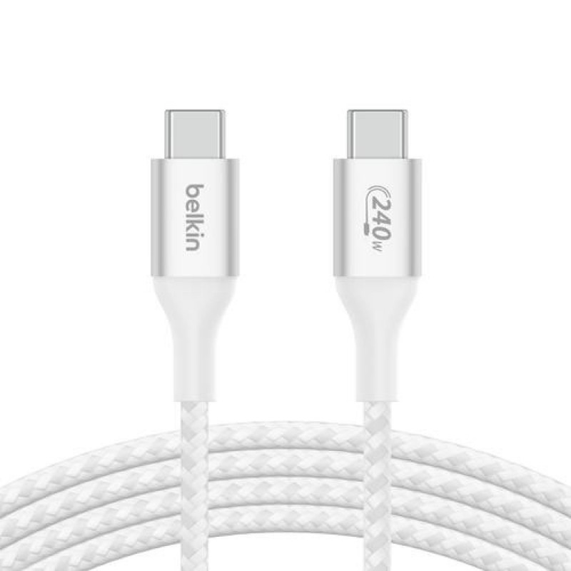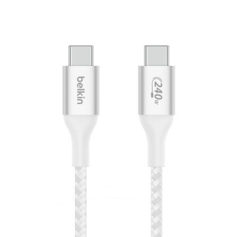 <b>Enhanced durability.</b><br>Its double-braided nylon exterior is tested to survive over 30,000 bends, giving you a reliable USB-C to USB-C cable that stands up to rigorous daily use.<br><br><b>Extra safety by design.</b><br>Dual E-marker chips with OTP (Over-Temperature Protection) ensure safe data and power delivery.<br><br><b>Up to 240W of fast charging.</b><br>Our durable USB-C to USB-C cable is ideal for at home, in the car, at the office, or anywhere you need to quickly transfer data and fast charge your devices.<br><br><b>USB-IF certified.</b><br>Our USB-C to USB-C cable is certified by USB-IF to be compliant with USB 2.0, and meets all electrical, mechanical, and environmental standards, ensuring a safe and optimal user experience.<br><br><b>Two lengths.</b><br>Available in 2M/6.6ft or 1M/3.3ft so you can pick your ideal length that’s perfect for your home, office or travel needs. They’re available in black and white, too.<br><br><b>One cable for all your USB-C devices.</b><br>Charge up to 240W and transfer high-speed data — use the same cable for your MacBook, iPad, Samsung tablet or smartphone, Google Pixel, or gaming device such as Nintendo Switch.Belkin CAB015bt1MWH. Cable length: 1 m. Connector 1: USB C, Connector 2: USB C, USB version: USB 2.0, Product colour: White